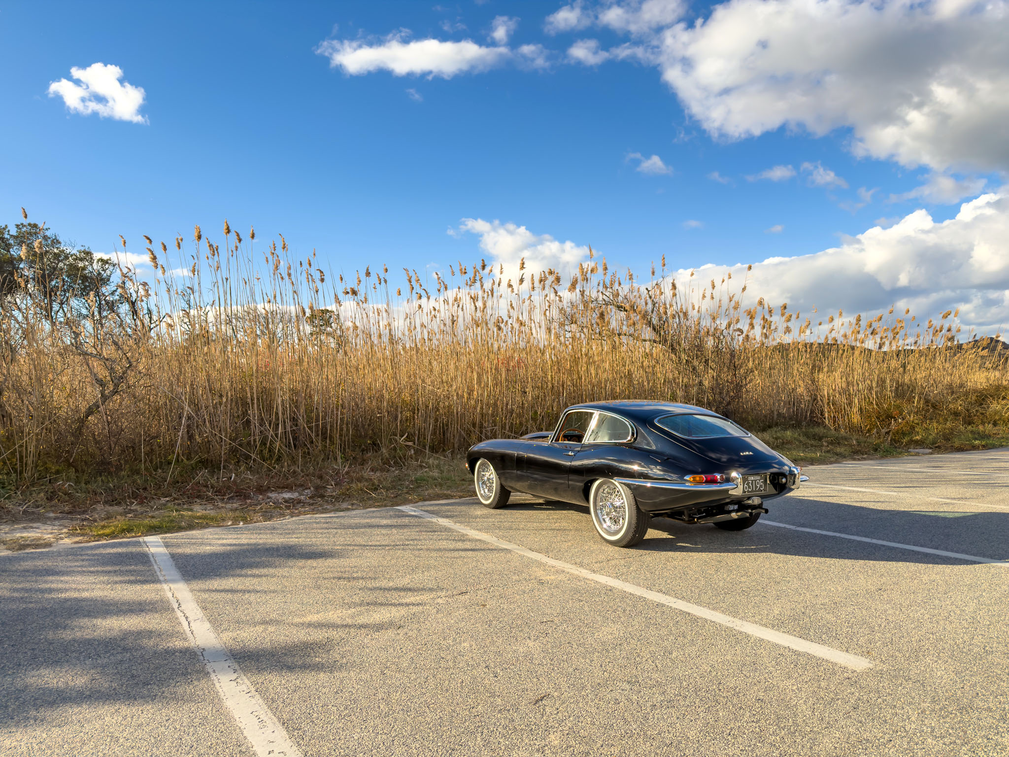 The covered headlamps, faired-in oval grille, and razor-thin chrome bumpers give it a predatory, feline tension; every curve is functional yet impossibly sensual—Malcolm Sayer’s aerodynamic background meets Enzo Ferrari’s famous “most beautiful car ever made” verdict.
