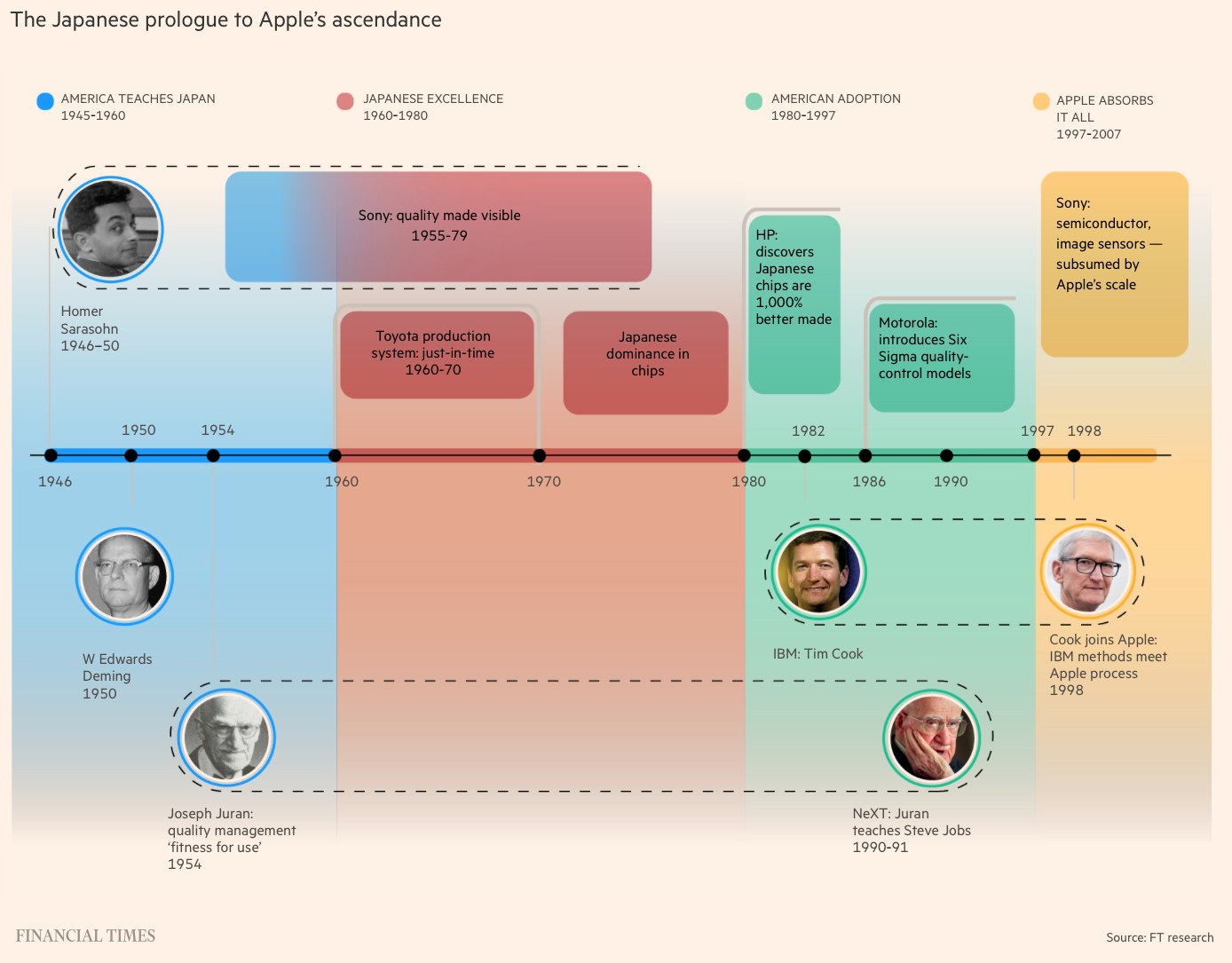 For me, the technical intrigue "lies in the subtle, multi-decade transmission of management philosophy—how abstract ideas about “total systems,” statistical control, and worker empowerment traveled from a 1940s Osaka hotel classroom to the precision engineering of a modern iPhone".