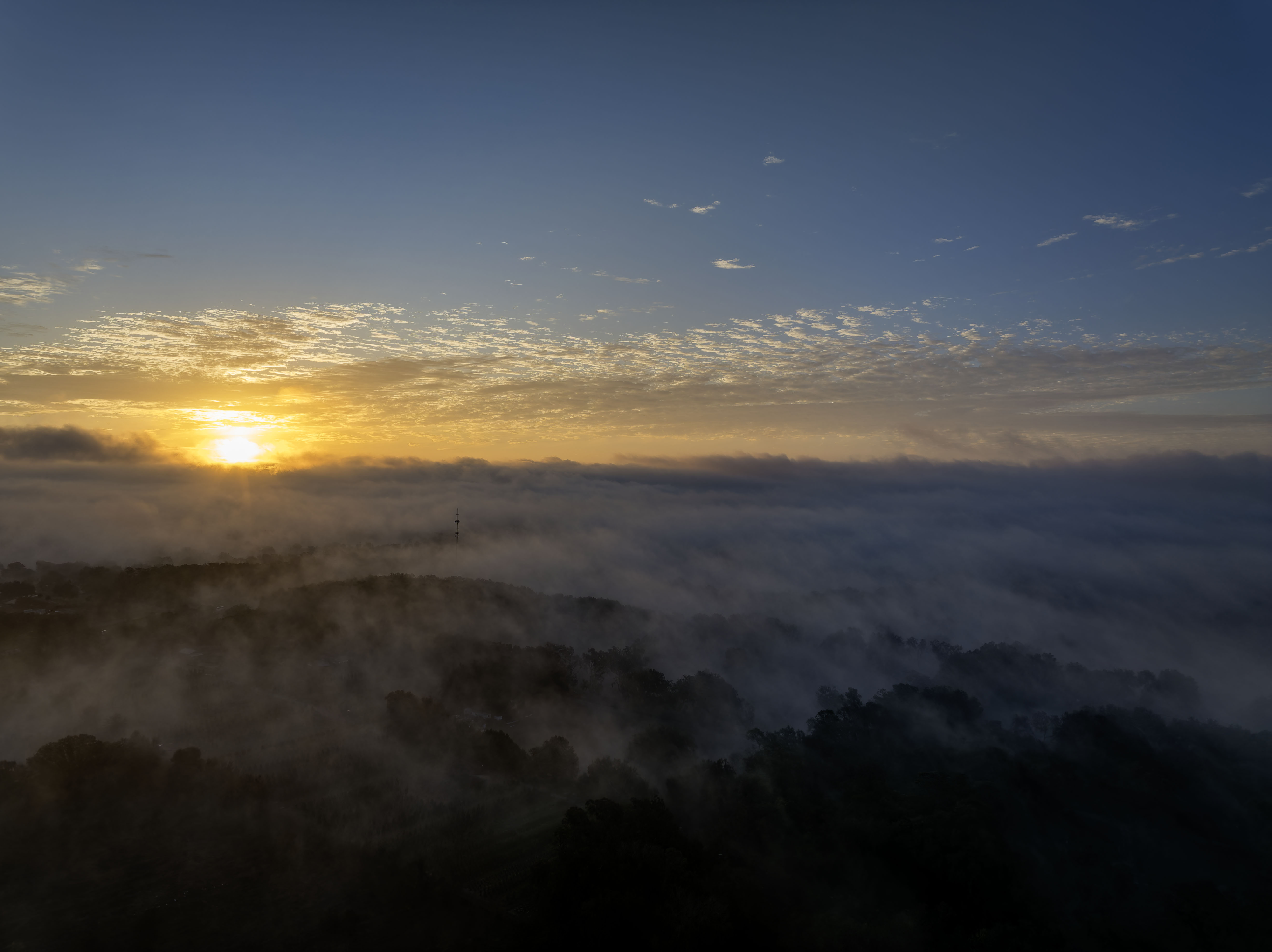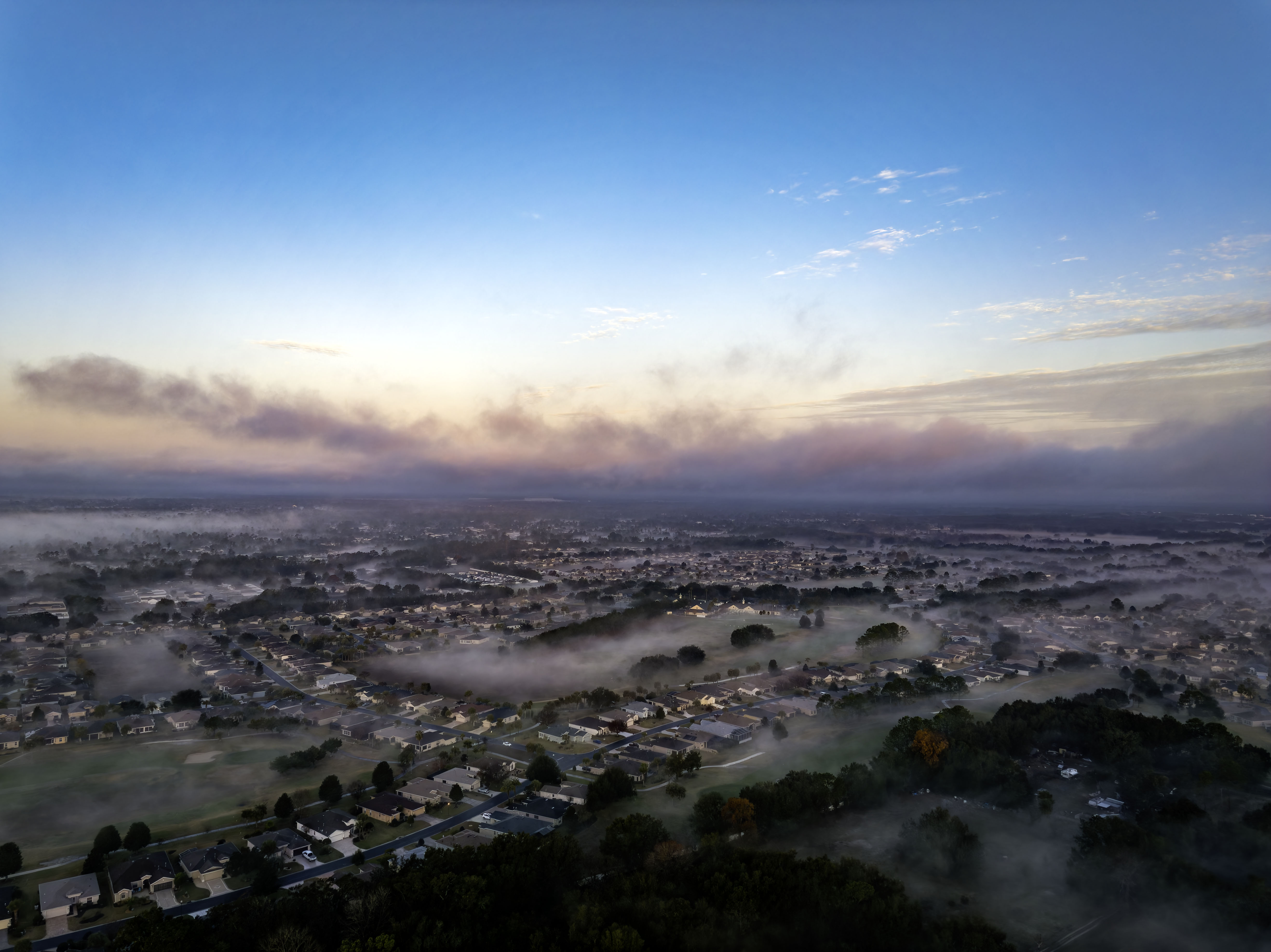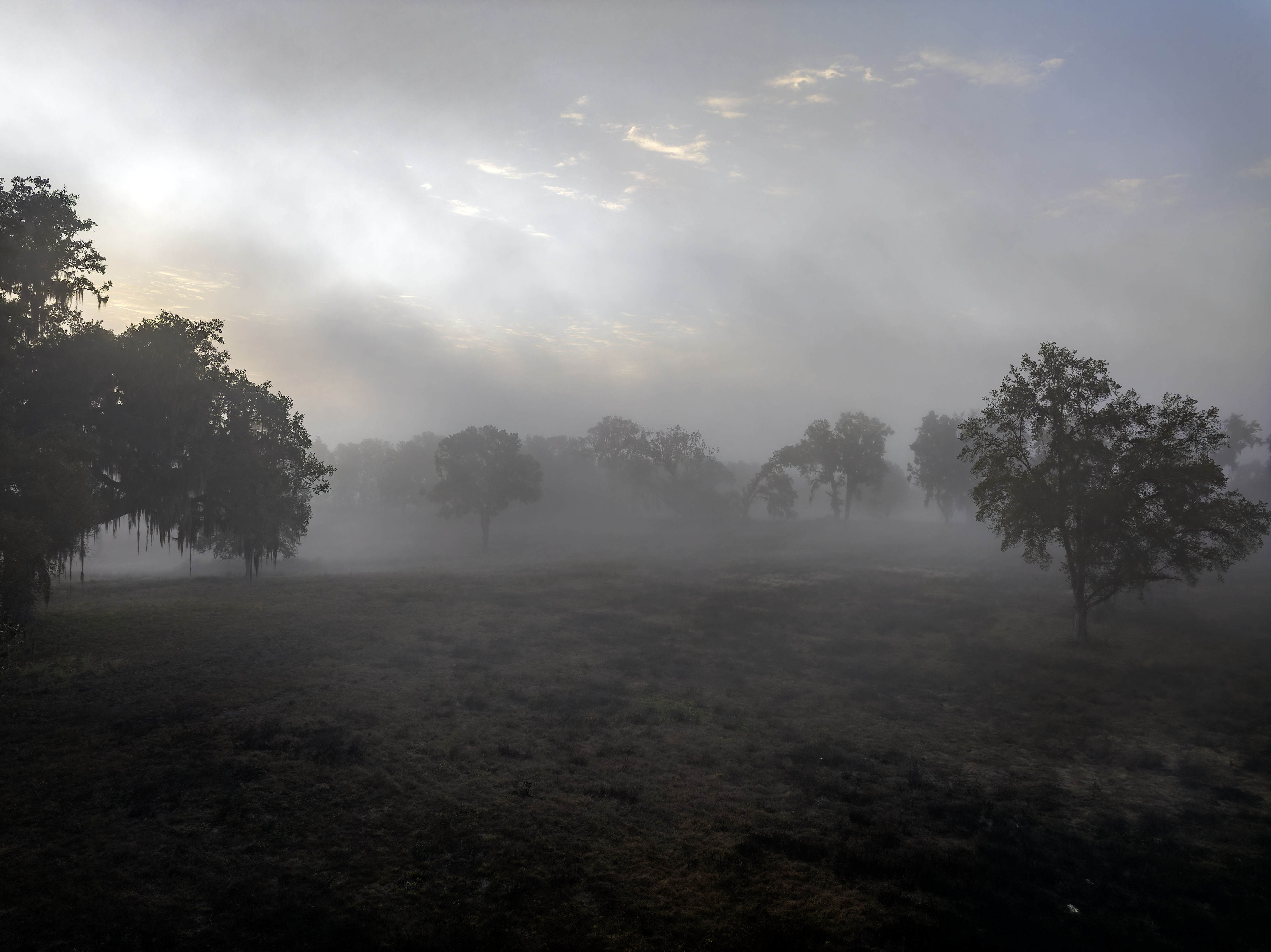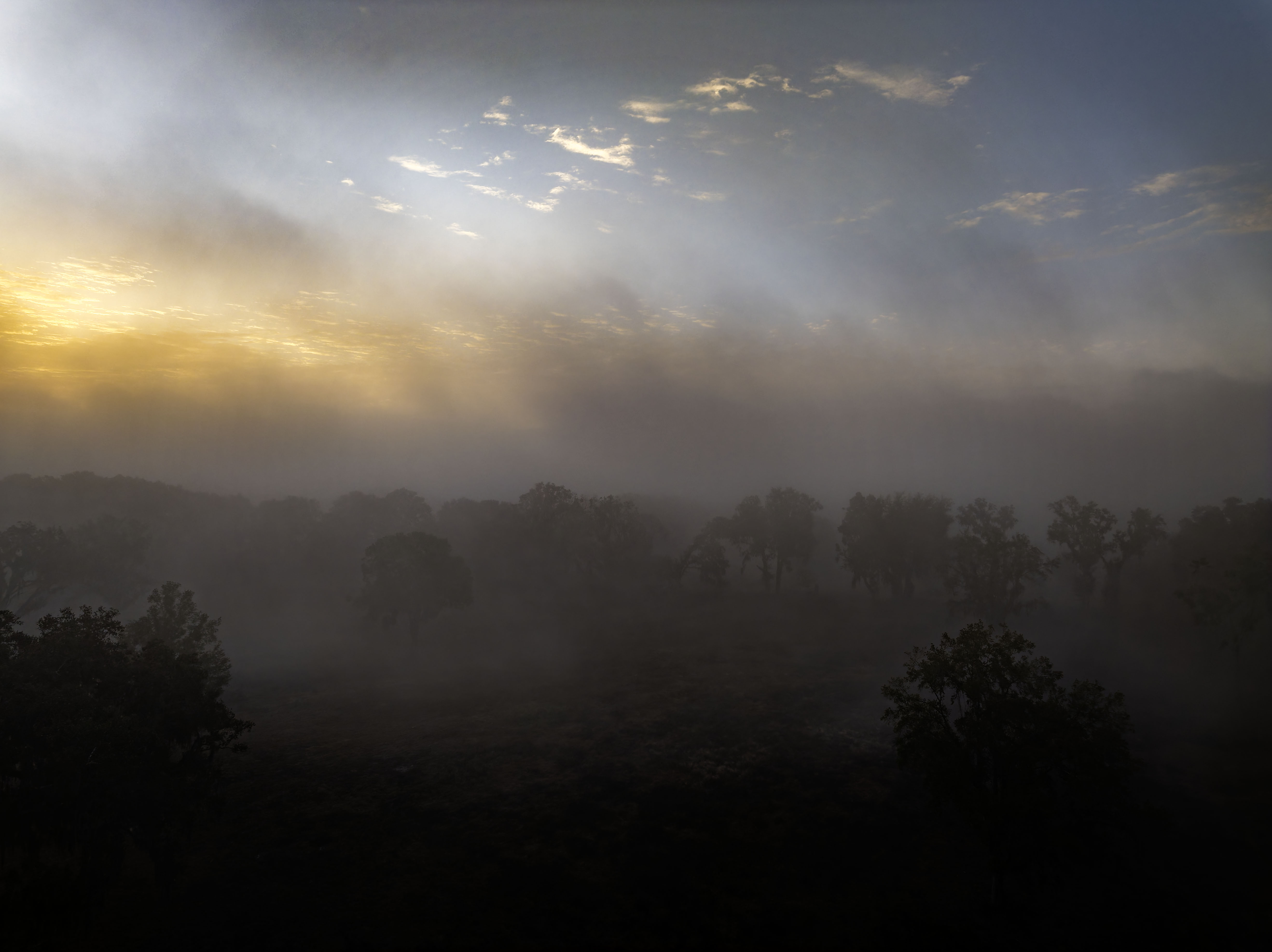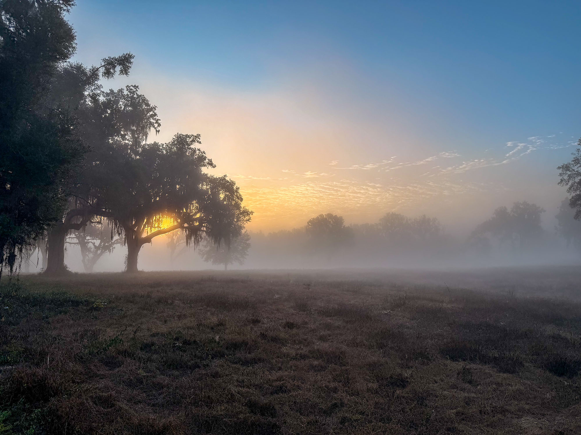 Gorgeous trees wrapped in morning fog. Birds. Farms.
