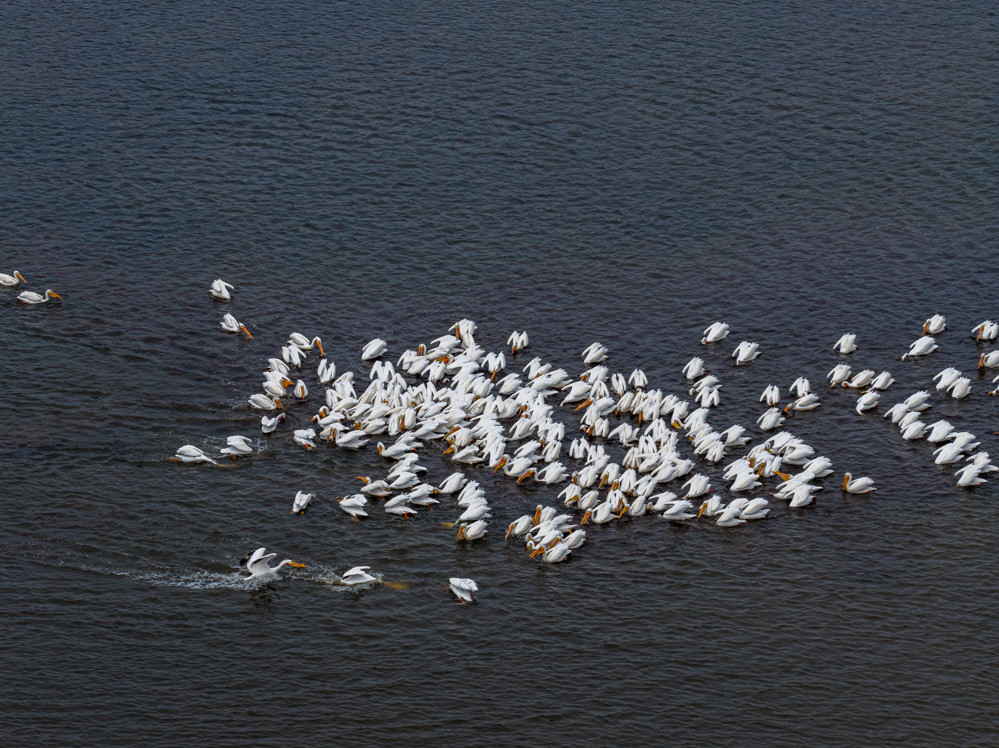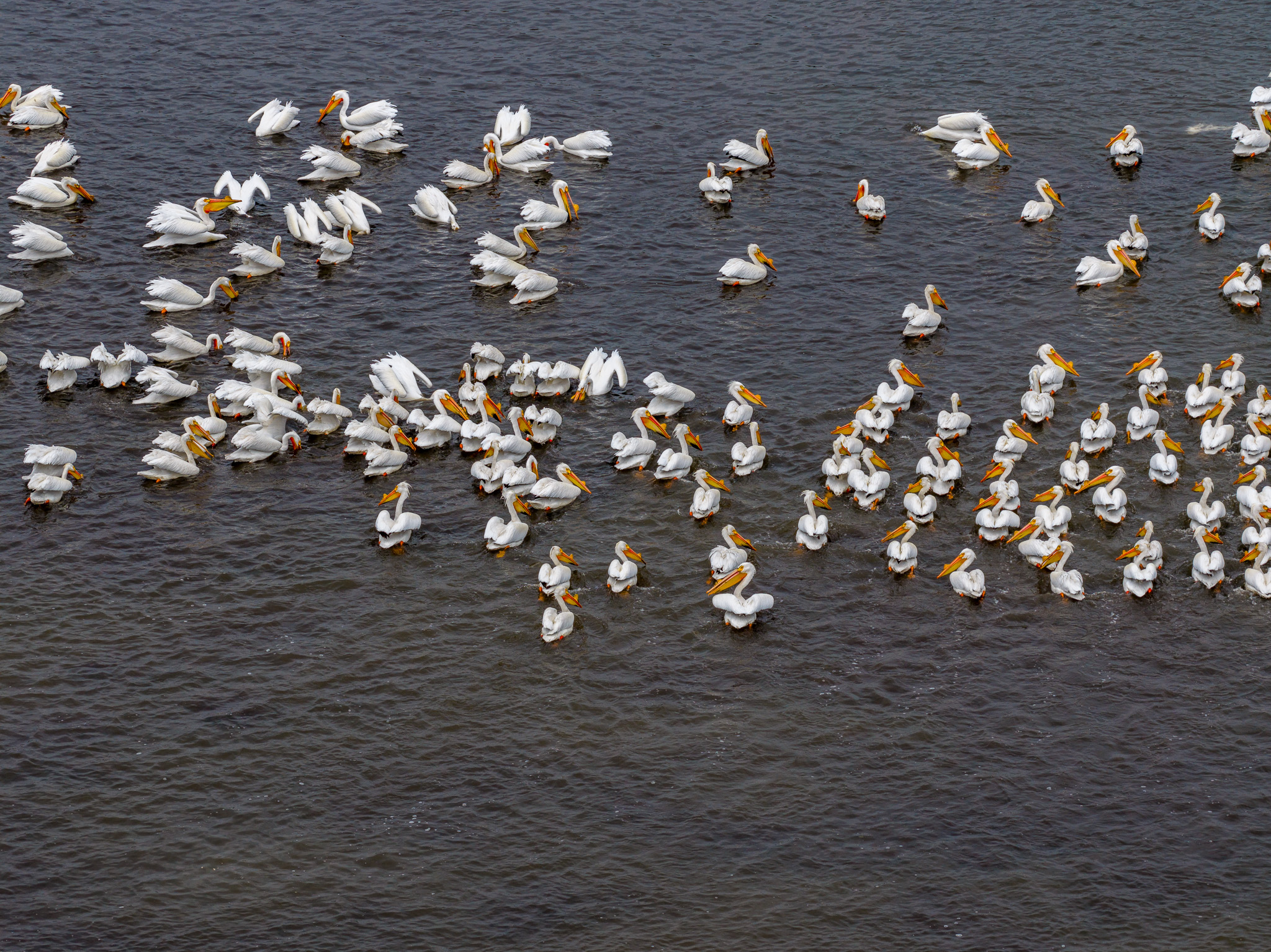 A flock of pelicans has decamped to nearby Fitchburg, WI, exploring spring conditions while fishing.